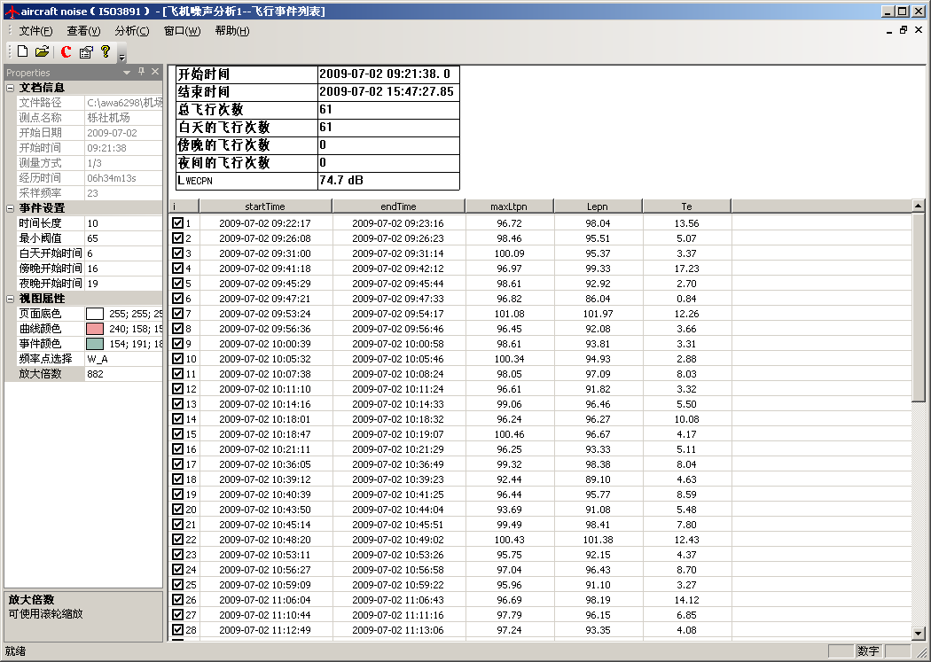 分析软件可以根据用户设定的判定依据自动判定出每一架次的飞行事件,按精密法或简易法计算出每一架次的有效感觉噪声级LEPN,再自动计算出全天的计权等效连续感觉噪声级LWECPN。还可根据各测点的测量结果或预测结果自动绘制噪声等值线图,生成报告。