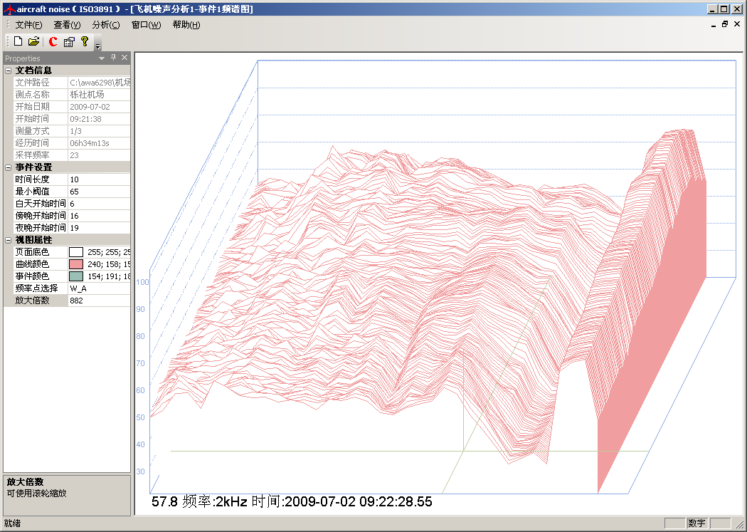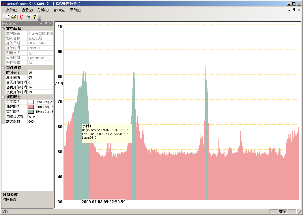 分析软件可以根据用户设定的判定依据自动判定出每一架次的飞行事件,按精密法或简易法计算出每一架次的有效感觉噪声级LEPN,再自动计算出全天的计权等效连续感觉噪声级LWECPN。还可根据各测点的测量结果或预测结果自动绘制噪声等值线图,生成报告。